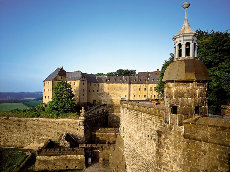 Ob mit dem Festungsexpress oder per pedes in einem kleinen Aufstieg – der Weg zur Festung Königstein, 361 m über dem Meeresspiegel auf einem Tafelberg gelegen, lohnt sich alle Mal. Weithin sichtbar thront die Festung, eingebettet in die bizarre Felsenlandschaft der Sächsischen Schweiz, auf dem Königstein. Heute ein riesiges Freilichtmuseum, ist sie die größte Bergfestung Europas.