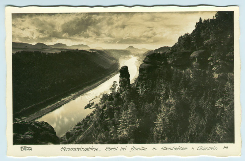 Fotografische Dokumente zeigen uns die Landschaft der Sächsischen Schweiz, wie sie damals war. Als Fotopionier Deutschlands und der Sächsischen Schweiz gilt Hermann Krone (1827-1916), der sich erstmalig auf eine „fotographische Landschaftstour“ durch die bizarre Felsenwelt begab und dabei erste Aufnahmen mit einer riesigen Holzkamera machte. Ebenfalls eine hohe Bekanntheit als Fotograf der Sächsischen Schweiz erreichte Walter Hahn (1889 – 1969). Er war oft in Schmilka unterwegs, so dass viele der heute noch erhaltenen historischen Aufnahmen von ihm stammen. Er fotografierte in schwarz-weiß mit einer Plattenkamera. Als Bergsteiger begann er zuerst mit Kletteraufnahmen und dokumentierte über viele Jahre eine der glanzvollsten Epochen der bergsteigerischen Erschließungszeit. Bald widmete er sich aber auch der Landschaft, Architektur und dem Luftbild. Die meisten Motive von ihm fanden sich damals auf Ansichtspostkarten wieder. Viele weitere Fotografen folgten Krone und Hahn und wanderten auf Motivsuche durch die Sächsische Schweiz.