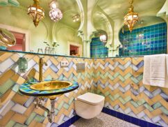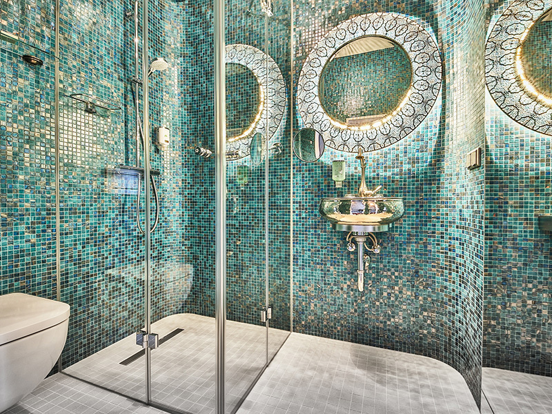 Im Stil des großen Architekten finden Sie hier vor allem ein wahres Meisterwerk – das extravagante Badezimmer. Wie alle Bäder im Haus ist auch dieses ein Gesamtkunstwerk, das jeden Aufenthalt zu einem einzigartigen Erlebnis macht.