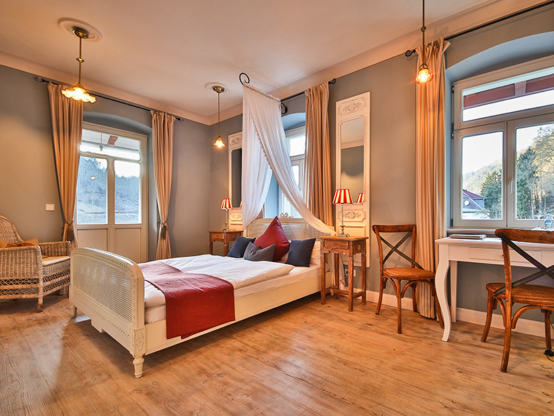 Dieses lichtdurchflutete, sonnige Zimmer ist ein wahres Schmuckstück. Der Balkon lädt dazu ein, die Seele baumeln zu lassen, während Sie den weiten Blick über das malerische Elbtal genießen – bis hin zu den Schrammsteinen, die flussabwärts majestätisch in den Himmel ragen.